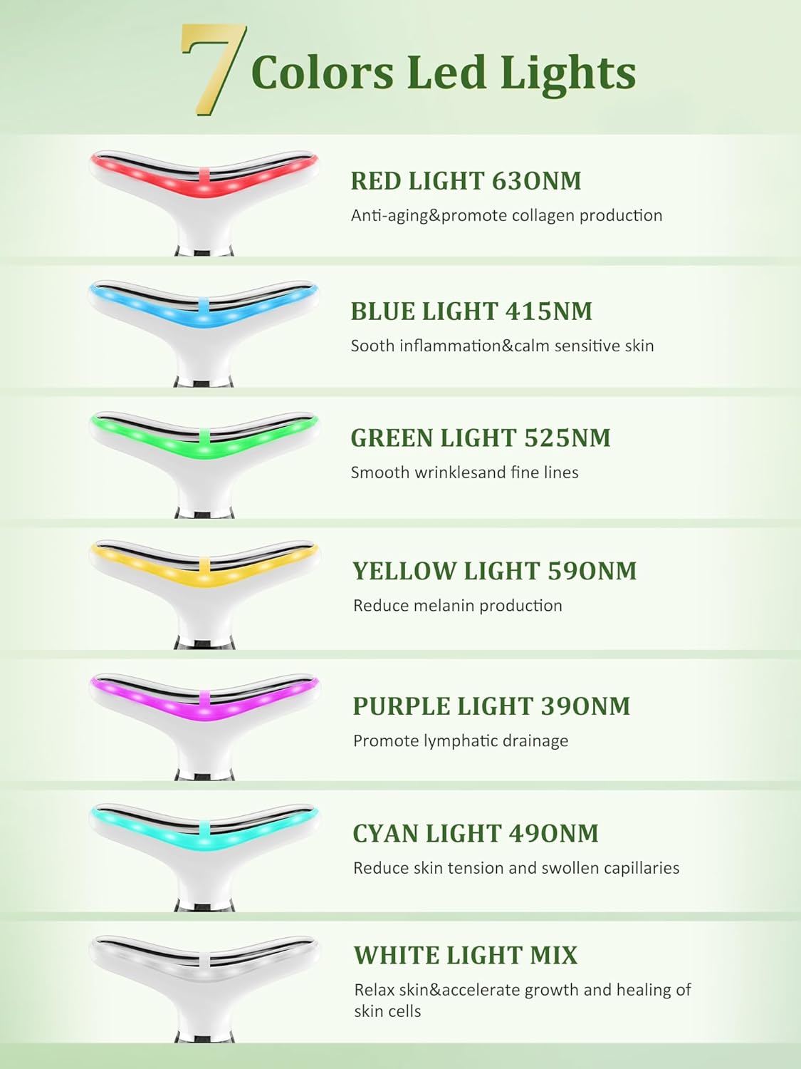 Multifunctional Beauty Gadget:Indulge in 7 light colors and experience targeted skin care.Red light (630nm) stimulates collagen to reduce wrinkles, restore elasticity. Blue light (415nm) purifies pores,sooth inflammation and calm sensitive skin.Green light (525nm) can smooth wrinklesand fine lines. Yellow light (590nm) reinforces skin barrier integrity and reduce melanin production ,evens tone. Cyan light (490nm) reduce skin tension and swollen capillaries. Purple light (390nm) accelerates skin renewal. White light can relax skin and repairs skin cells.—synergistically targeting aging, texture, and radiance concerns