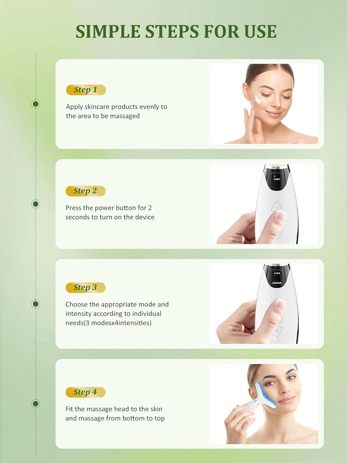 Customized Massage Experience:Choose from 3 massage modes with 4 adjustable intensity levels to cater to your specific needs.Our gua sha face sculpting tool device features buttons with four adjustable intensity levels for personalized comfort. The massage function revitalizes skin, while targeted heating will active our skin,enhancing product absorption. A dedicated cleansing mode deepens purification. Effortlessly switch settings via intuitive controls that leaves skin smooth, firm, and naturally radiant